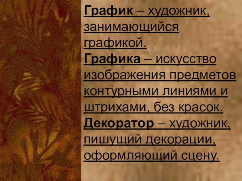 График – художник, занимающийся графикой. Графика – искусство изображения предметов контурными линиями и штрихами, без красок. Декоратор