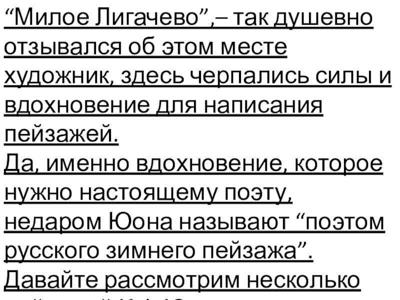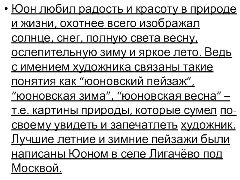 изображал солнце, снег, полную света весну, ослепительную зиму и яркое лето. Ведь с имением художника связаны такие понятия как “юоновский пейзаж”, “юоновская зима”, “юоновская весна” – т.е. картины природы, которые сумел по-своему увидеть и запечатлеть художник. Лучшие летние и зимние пейзажи были написаны Юоном в селе Лигачёво под Москвой.
