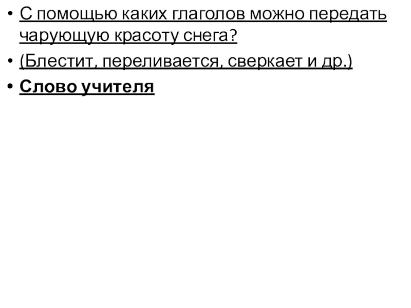 С помощью каких глаголов можно передать чарующую красоту снега?(Блестит, переливается, сверкает и др.)Слово учителя