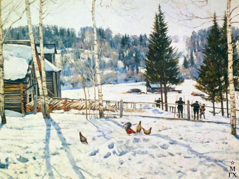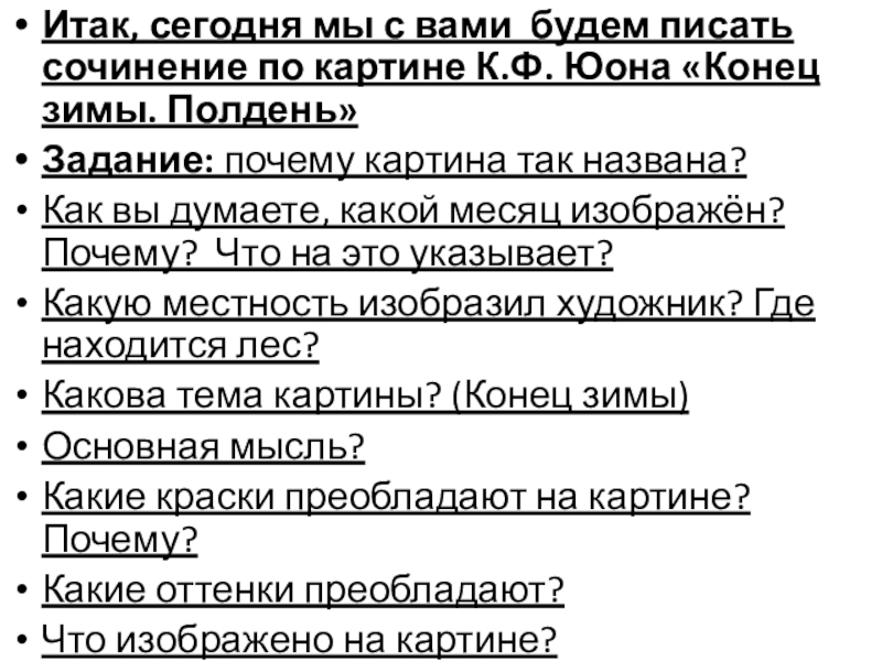 Итак, сегодня мы с вами будем писать сочинение по картине К.Ф. Юона «Конец зимы. Полдень»Задание: почему картина