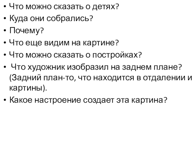 Что можно сказать о детях?Куда они собрались?Почему?Что еще видим на картине?Что можно сказать о постройках? Что художник