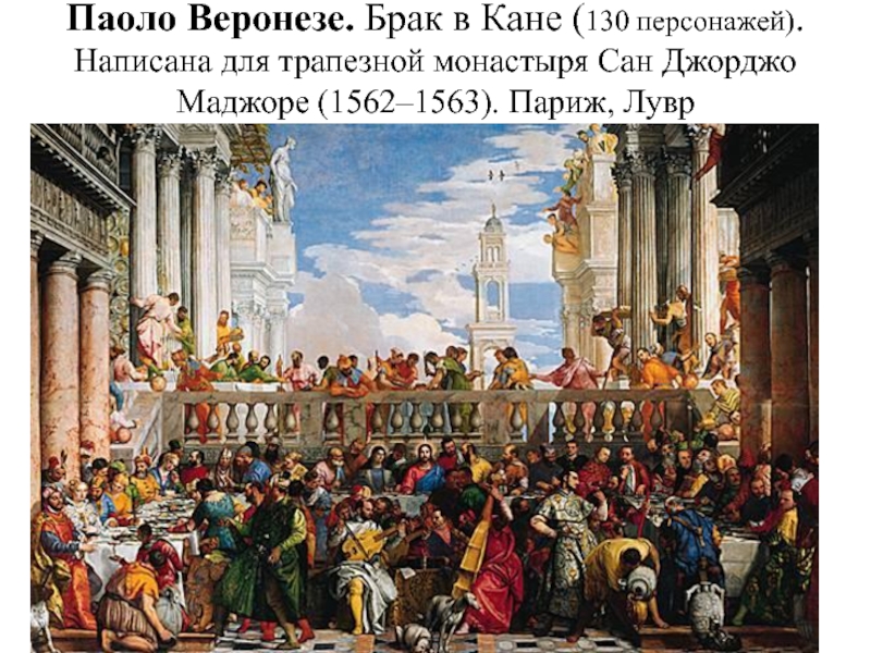 Слайд 27Паоло Веронезе. Брак в Кане (130 персонажей). Написана для трапезной монастыря