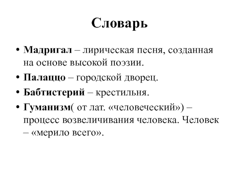 Гуманизм( от лат. «человеческий») – процесс возвеличивания человека. Человек – «мерило всего».