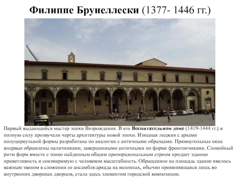 Воспитательном доме (1419-1444 гг.) в полную силу прозвучали черты архитектуры новой эпохи. Изящная лоджия с арками полуциркульной формы разработана по аналогии с античными образцами. Прямоугольные окна впервые обрамлены наличниками, завершенными античными по форме фронтончиками. Спокойный ритм форм вместе с тонко найденным общим пропорциональным строем придает зданию приветливость и соизмеримую с человеком масштабность. Обращенное на площадь здание явилось важным звеном в сложении ее ансамбля:аркада на колоннах, обычно применявшаяся лишь во внутренних двориках дворцов, стала здесь элементом городской композиции.