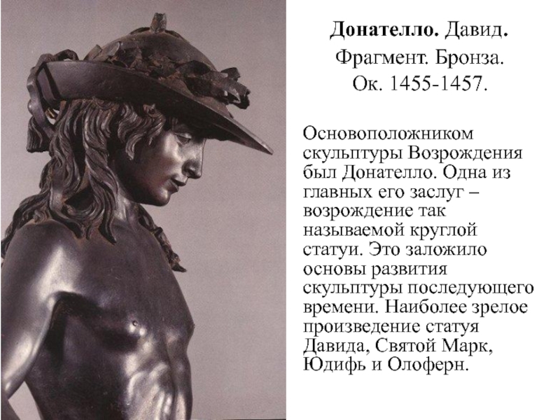 Слайд 46Донателло. Давид. Фрагмент. Бронза.