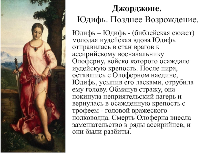 вдова Юдифь отправилась в стан врагов к ассирийскому военачальнику Олоферну, войско которого осаждало иудейскую крепость. После пира, оставшись с Олоферном наедине, Юдифь, усыпив его ласками, отрубила ему голову. Обманув стражу, она покинула неприятельский лагерь и вернулась в осажденную крепость с трофеем - головой вражеского полководца. Смерть Олоферна внесла замешательство в ряды ассирийцев, и они были разбиты.