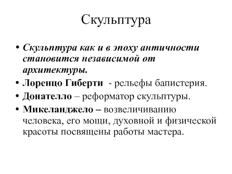 Скульптура как и в эпоху античности становится независимой от архитектуры.