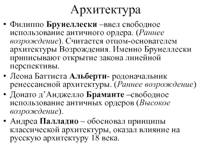 Филиппо Брунеллески –ввел свободное использование античного ордера. (Раннее возрождение). Считается отцом-основателем