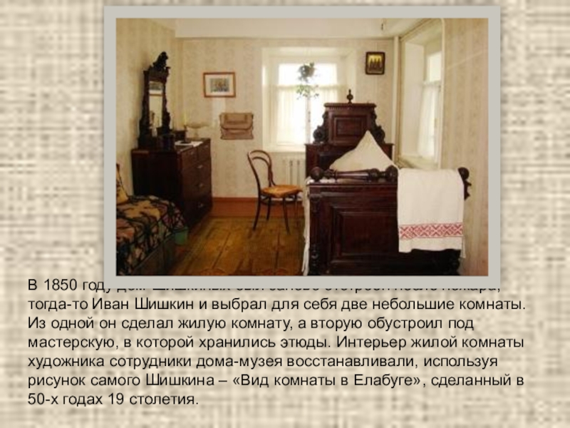 Иван Шишкин и выбрал для себя две небольшие комнаты. Из одной он сделал жилую комнату, а вторую обустроил под мастерскую, в которой хранились этюды. Интерьер жилой комнаты художника сотрудники дома-музея восстанавливали, используя рисунок самого Шишкина – «Вид комнаты в Елабуге», сделанный в 50-х годах 19 столетия.