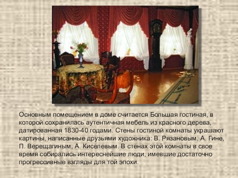 мебель из красного дерева, датированная 1830-40 годами. Стены гостиной комнаты украшают картины, написанные друзьями художника: В. Рязановым, А. Гине, П. Верещагиным, А. Киселевым. В стенах этой комнаты в свое время собирались интереснейшие люди, имевшие достаточно прогрессивные взгляды для той эпохи.