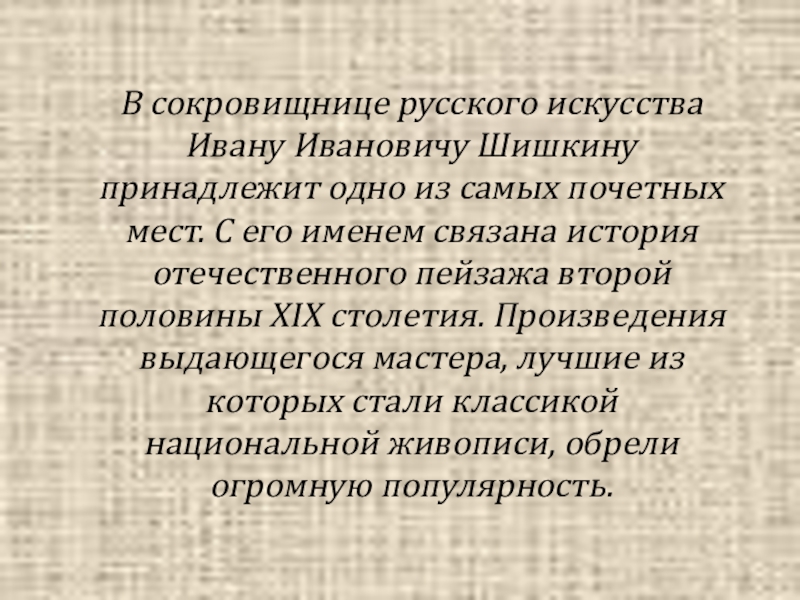 Слайд 3В сокровищнице русского искусства Ивану Ивановичу Шишкину принадлежит одно из самых