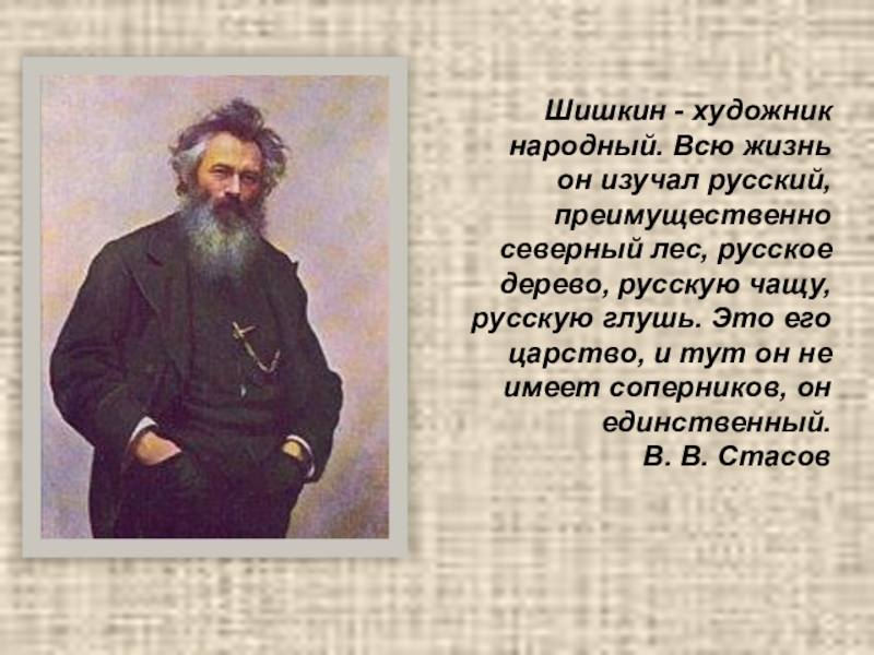 Слайд 2Шишкин - художник народный. Всю жизнь он изучал русский, преимущественно северный