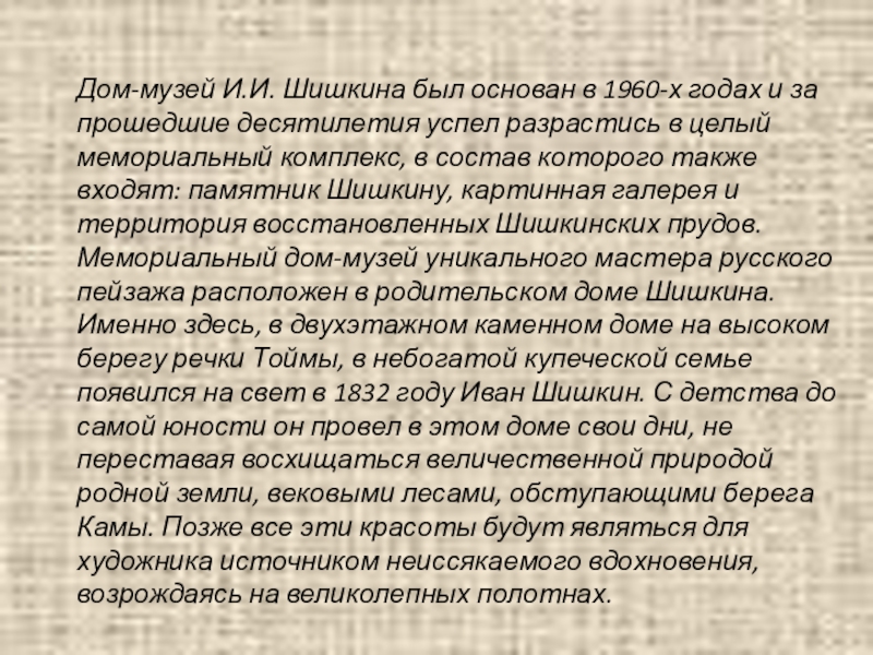 Слайд 7Дом-музей И.И. Шишкина был основан в 1960-х годах и за прошедшие