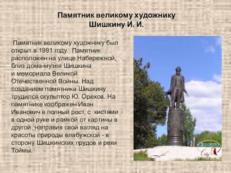 Слайд 13Памятник великому художнику Шишкину И. И.