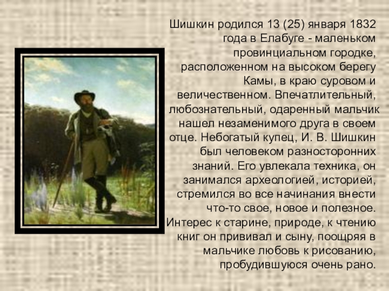провинциальном городке, расположенном на высоком берегу Камы, в краю суровом и величественном. Впечатлительный, любознательный, одаренный мальчик нашел незаменимого друга в своем отце. Небогатый купец, И. В. Шишкин был человеком разносторонних знаний. Его увлекала техника, он занимался археологией, историей, стремился во все начинания внести что-то свое, новое и полезное. Интерес к старине, природе, к чтению книг он прививал и сыну, поощряя в мальчике любовь к рисованию, пробудившуюся очень рано.