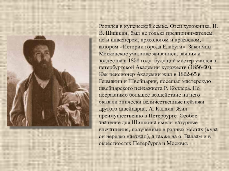 только предпринимателем, но и инженером, археологом и краеведом, автором «Истории города Елабуги». Закончив Московское училище живописи, ваяния и зодчества в 1856 году, будущий мастер учился в петербургской Академии художеств (1856-60). Как пенсионер Академии жил в 1862-65 в Германии и Швейцарии, посещал мастерскую швейцарского пейзажиста Р. Коллера. Но несравнимо большее воздействие на него оказали эпически величественные пейзажи другого швейцарца, А. Калама. Жил преимущественно в Петербурге. Особое значение для Шишкина имели натурные впечатления, полученные в родных местах (куда он нередко наезжал), а также на о. Валаам и в окрестностях Петербурга и Москвы.