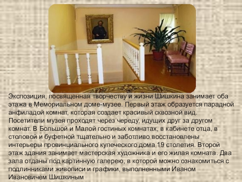 доме-музее. Первый этаж образуется парадной анфиладой комнат, которая создает красивый сквозной вид. Посетители музея проходят через череду, идущих друг за другом комнат. В Большой и Малой гостиных комнатах, в кабинете отца, в столовой и буфетной тщательно и заботливо восстановлены интерьеры провинциального купеческого дома 19 столетия. Второй этаж здания занимает мастерская художника и его жилая комната. Два зала отданы под картинную галерею, в которой можно ознакомиться с подлинниками живописи и графики, выполненными Иваном Ивановичем Шишкиным