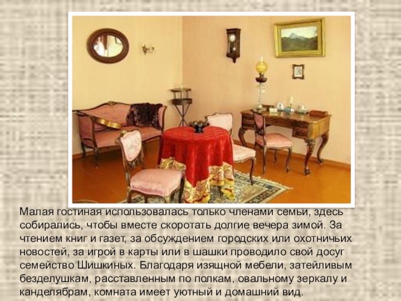 долгие вечера зимой. За чтением книг и газет, за обсуждением городских или охотничьих новостей, за игрой в карты или в шашки проводило свой досуг семейство Шишкиных. Благодаря изящной мебели, затейливым безделушкам, расставленным по полкам, овальному зеркалу и канделябрам, комната имеет уютный и домашний вид.