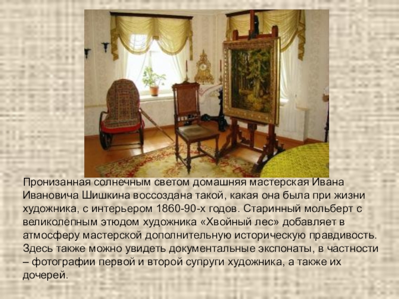 Слайд 12Пронизанная солнечным светом домашняя мастерская Ивана Ивановича Шишкина воссоздана такой, какая