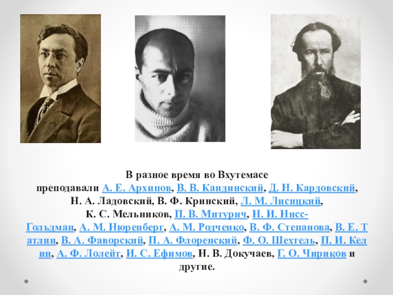 Слайд 7В разное время во Вхутемасе преподавали А. Е. Архипов, В. В. Кандинский, Д. Н. Кардовский, Н. А. Ладовский, В. Ф. Кринский, Л. М. Лисицкий, К. С. Мельников, П. В. Митурич, Н. И. Нисс-Гольдман, А. М. Нюренберг, А. М. Родченко, В. Ф. Степанова, В. Е. Татлин, В. А. Фаворский, П. А. Флоренский, Ф. О. Шехтель, П. И. Келин, А. Ф. Лолейт, И. С. Ефимов, Н. В. Докучаев, Г. О. Чириков и другие.