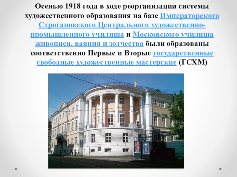 Строгановского Центрального художественно-промышленного училища и Московского училища живописи, ваяния и зодчества были образованы соответственно Первые и Вторые государственные свободные художественные мастерские (ГСХМ)