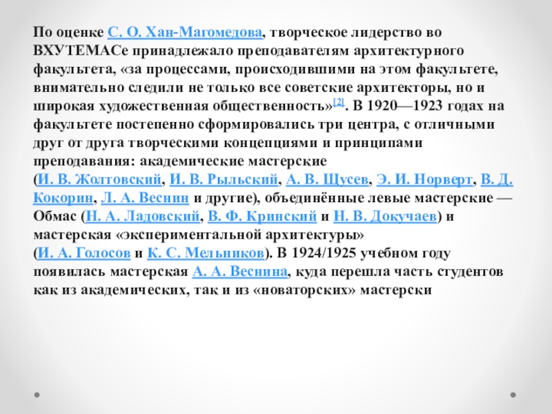 Слайд 6По оценке С. О. Хан-Магомедова, творческое лидерство во ВХУТЕМАСе принадлежало преподавателям архитектурного факультета, «за
