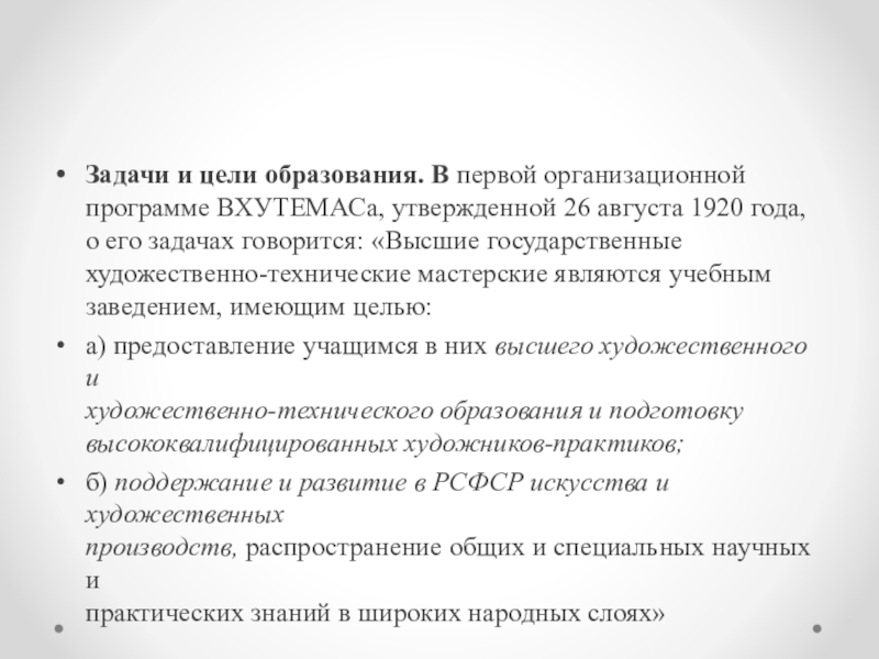 Слайд 5Задачи и цели образования. В первой организационной программе ВХУТЕМАСа, утвержденной 26