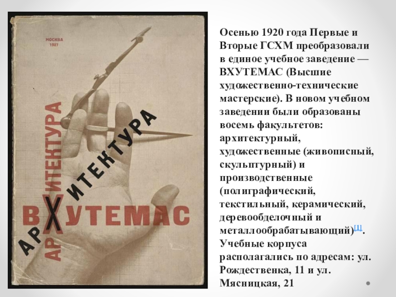 заведение — ВХУТЕМАС (Высшие художественно-технические мастерские). В новом учебном заведении были образованы восемь факультетов: архитектурный, художественные (живописный, скульптурный) и производственные (полиграфический, текстильный, керамический, деревообделочный и металлообрабатывающий)[1]. Учебные корпуса располагались по адресам: ул. Рождественка, 11 и ул. Мясницкая, 21