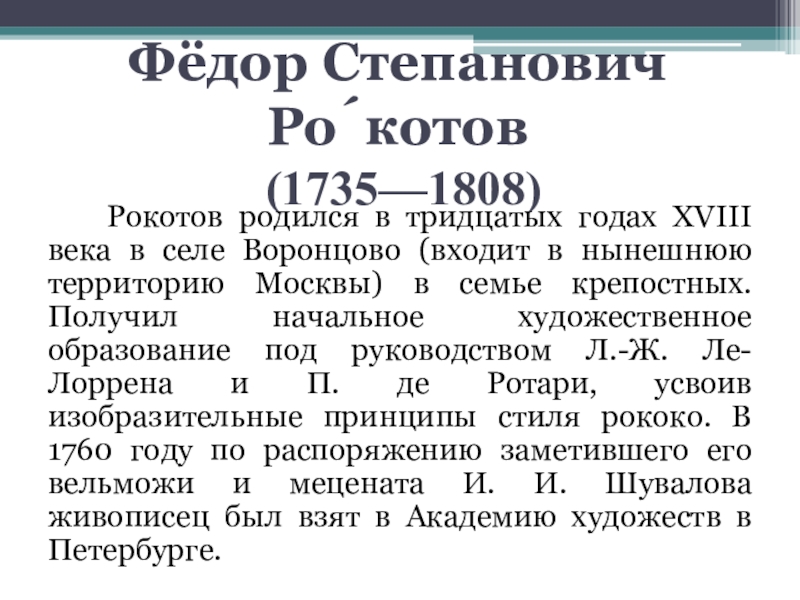 Фёдор Степанович Ро́котов  (1735—1808) Рокотов родился в тридцатых годах XVIII века в селе Воронцово (входит в