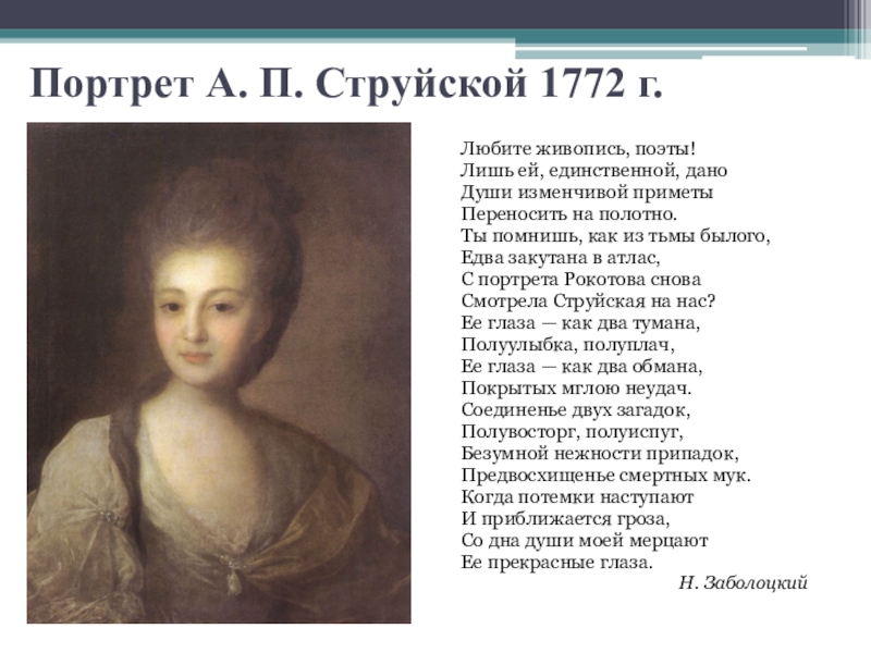 Портрет А. П. Струйской 1772 г.Любите живопись, поэты!Лишь ей, единственной, даноДуши изменчивой приметыПереносить на полотно.Ты помнишь, как