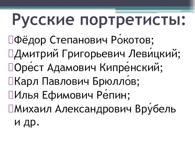 Русские портретисты:Фёдор Степанович Ро́котов; Дмитрий Григорьевич Леви́цкий;Оре́ст Адамович Кипре́нский;Карл Павлович Брюлло́в; Илья Ефимович Ре́пин; Михаил Александрович Вру́бель