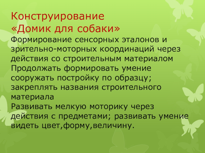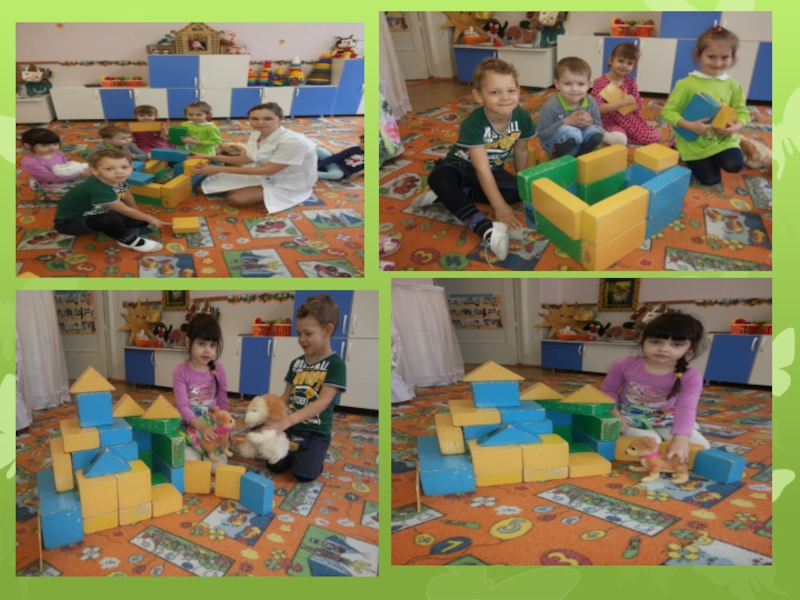 Продолжать формировать умение сооружать постройку по образцу; закреплять названия строительного материала