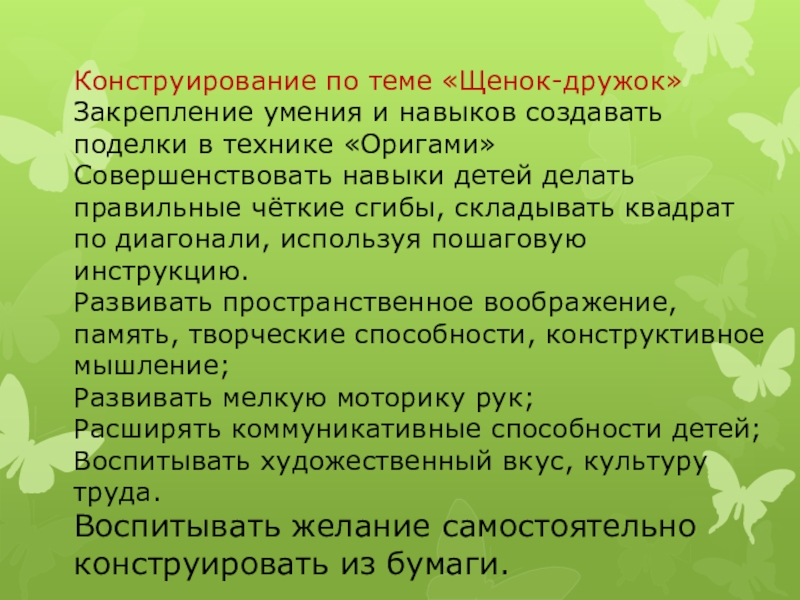 Совершенствовать навыки детей делать правильные чёткие сгибы, складывать квадрат по диагонали, используя пошаговую инструкцию.