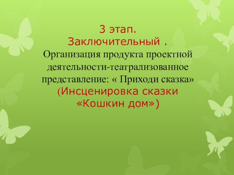 Организация продукта проектной деятельности-театрализованное представление: « Приходи сказка» (Инсценировка