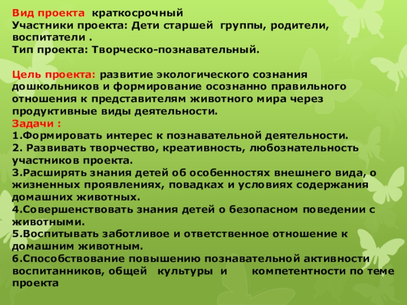 Цель проекта: развитие экологического сознания дошкольников и формирование осознанно правильного отношения к представителям животного мира через продуктивные виды деятельности.