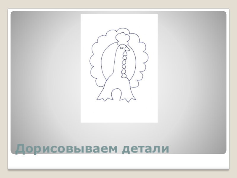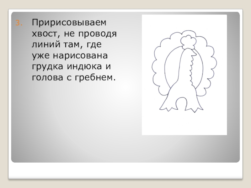 Слайд 24Пририсовываем хвост, не проводя линий там, где уже нарисована грудка индюка