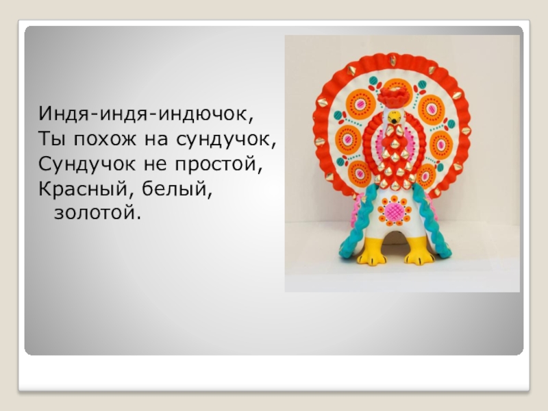 Индя-индя-индючок,Ты похож на сундучок, Сундучок не простой,Красный, белый, золотой.