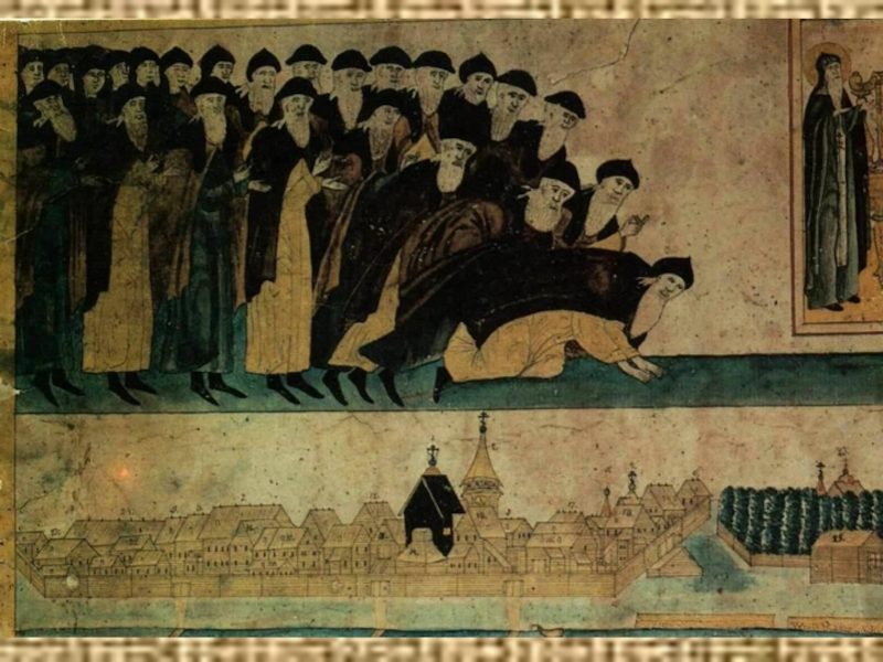 Слайд 13Панорама Выговского и Лексинского общежительств и поклонение иконе Богоматери