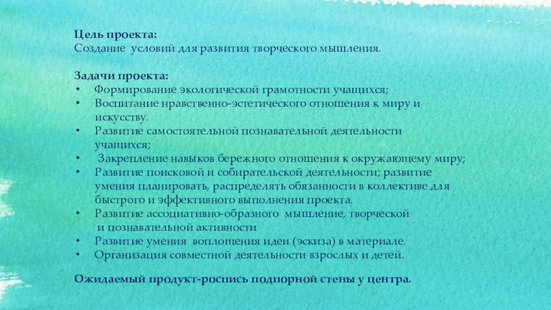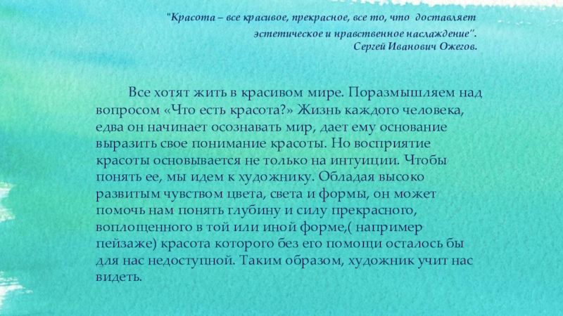 Все хотят жить в красивом мире. Поразмышляем над вопросом «Что есть красота?» Жизнь каждого человека, едва он начинает осознавать мир, дает ему основание выразить свое понимание красоты. Но восприятие красоты основывается не только на интуиции. Чтобы понять ее, мы идем к художнику. Обладая высоко развитым чувством цвета, света и формы, он может помочь нам понять глубину и силу прекрасного, воплощенного в той или иной форме,( например пейзаже) красота которого без его помощи осталось бы для нас недоступной. Таким образом, художник учит нас видеть.