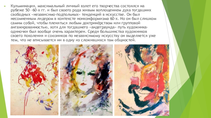 Слайд 5Кульминация, максимальный личный взлет его творчества состоялся на рубеже 50—60-х гг.