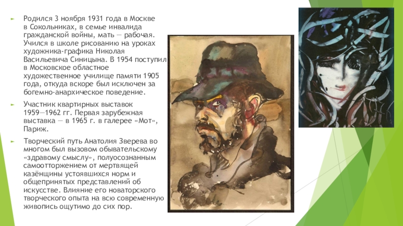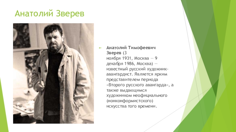 Анатолий ЗверевАнатолий Тимофеевич Зверев (3 ноября 1931, Москва — 9 декабря 1986, Москва) — известный русский художник-авангардист. Является ярким представителем периода «Второго русского авангарда», а также