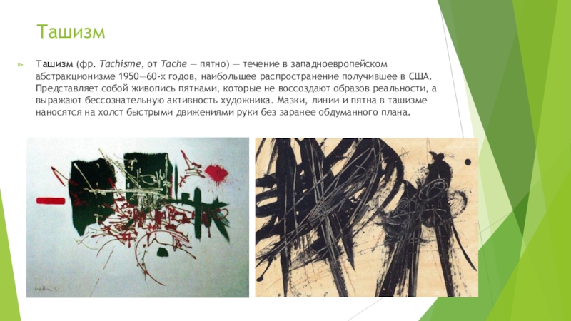 в США. Представляет собой живопись пятнами, которые не воссоздают образов реальности, а выражают бессознательную активность художника. Мазки, линии и пятна в ташизме наносятся на холст быстрыми движениями руки без заранее обдуманного плана.