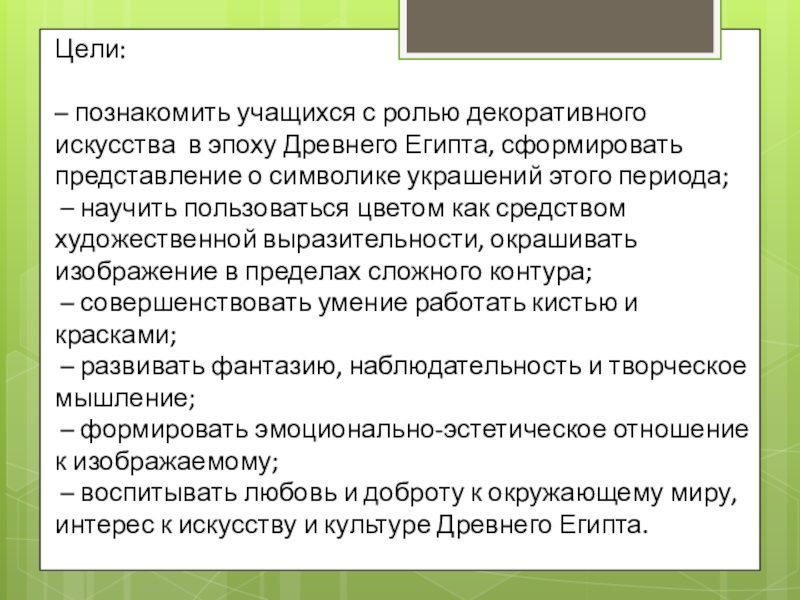 – познакомить учащихся с ролью декоративного искусства в эпоху Древнего
