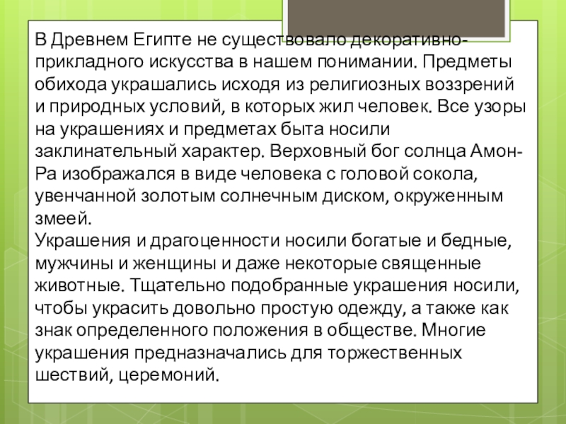 Слайд 3В Древнем Египте не существовало декоративно-прикладного искусства в нашем понимании. Предметы