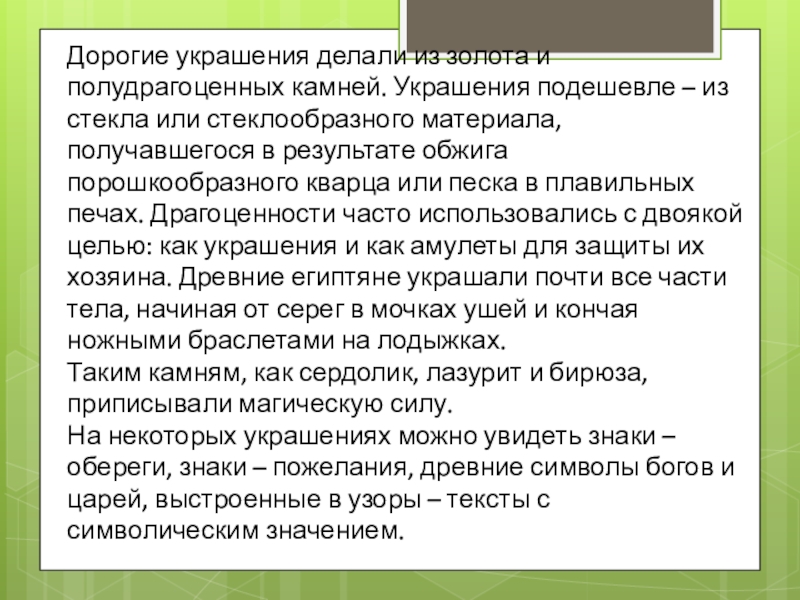 из стекла или стеклообразного материала, получавшегося в результате обжига порошкообразного кварца или песка в плавильных печах. Драгоценности часто использовались с двоякой целью: как украшения и как амулеты для защиты их хозяина. Древние египтяне украшали почти все части тела, начиная от серег в мочках ушей и кончая ножными браслетами на лодыжках.