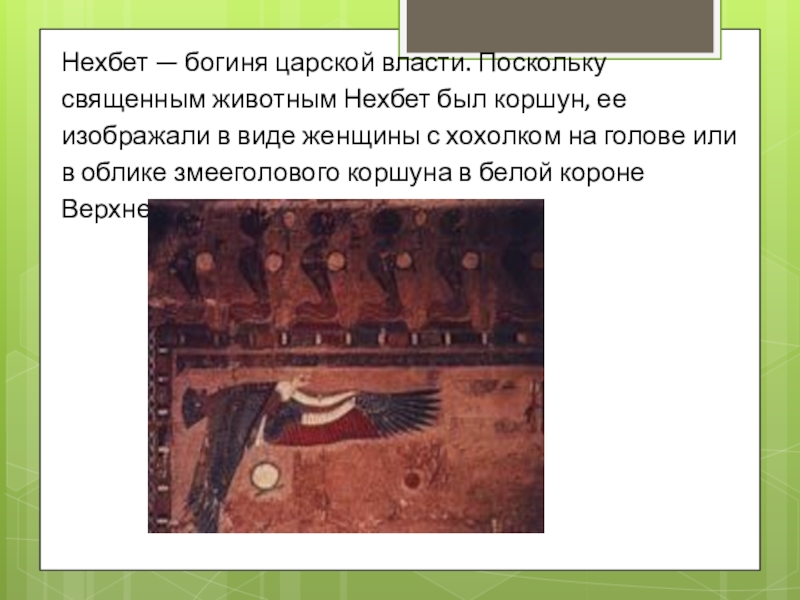 Слайд 9Нехбет — богиня царской власти. Поскольку священным животным Нехбет был коршун,