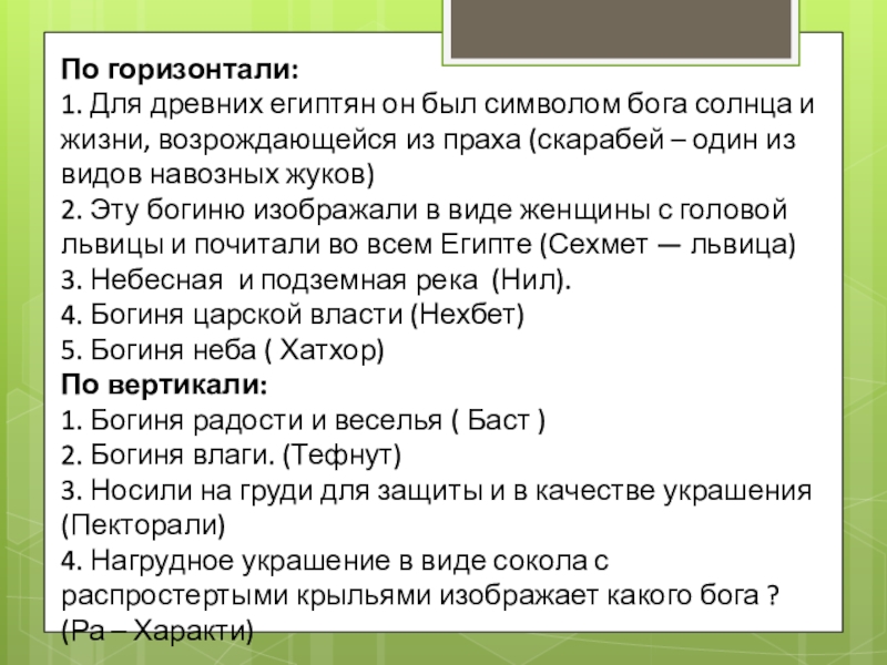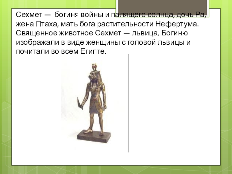 Слайд 10Сехмет — богиня войны и палящего солнца, дочь Ра, жена Птаха,