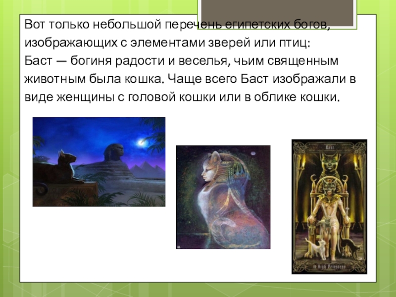 Баст — богиня радости и веселья, чьим священным животным была кошка. Чаще всего Баст изображали в виде женщины с головой кошки или в облике кошки.