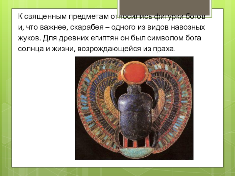 Слайд 6К священным предметам относились фигурки богов и, что важнее, скарабея –