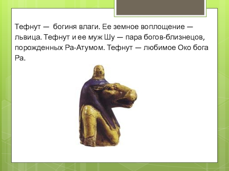 Слайд 11Тефнут — богиня влаги. Ее земное воплощение — львица. Тефнут и